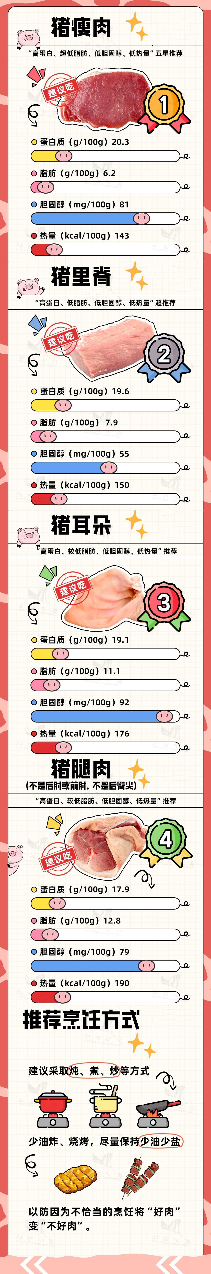 ✨按照“高蛋白、低脂肪、低胆固醇、低热量”的标准,建议在四个位置食用:猪瘦肉、猪里脊、猪耳、猪腿肉。