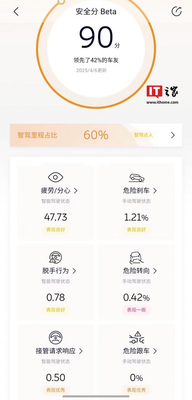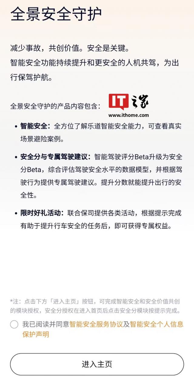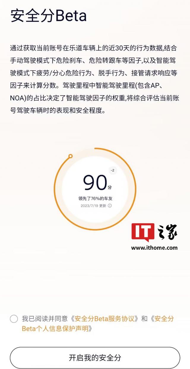 IT 家庭参照相应的“安全分” Beta 根据服务协议,这个“安全分” Beta “系统会得到的在乐道车辆附近,车主帐户 30 天行为数据,在智能驾驶模式下,结合危险刹车、危险转跟车等因素,以及智能驾驶模式中的疲劳 / 分数由分数计算,如分心危险行为、出售行为、接管请求等。其中,智能里程(包括驾驶里程) AP、NOA)智能驾驶因素的权重是由比例决定的。