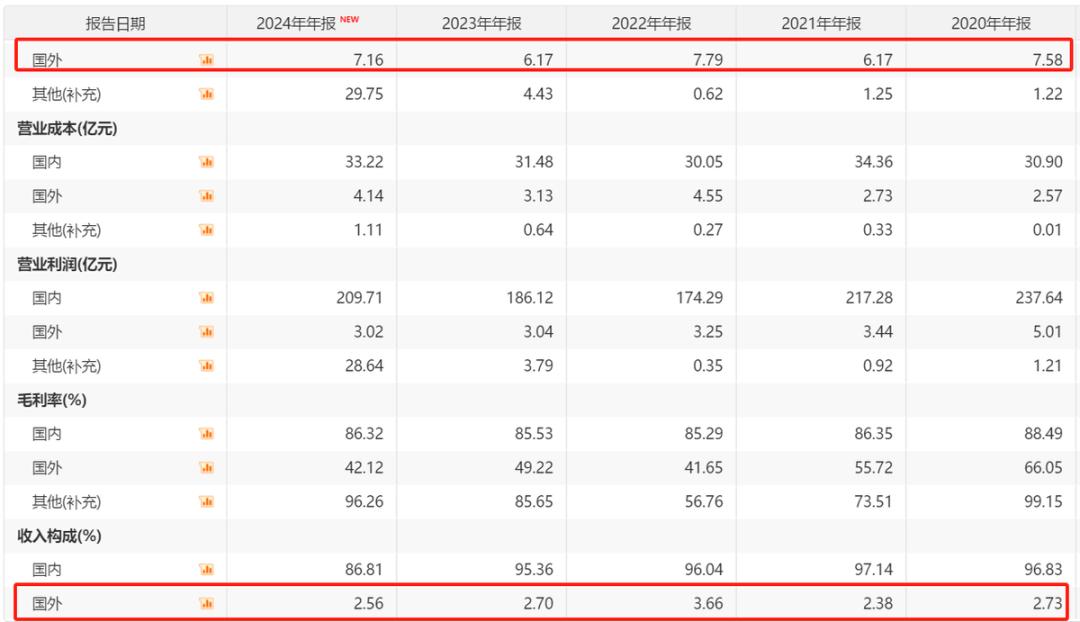 根据证券软件的数据,从2020年到2024年,国外的利润分别为7.58亿元、6.17亿元、7.79亿元、6.17亿元和7.16亿元,分别占恒瑞制药目前营收的2.73%、2.38%、3.66%、2.70%、2.56%。