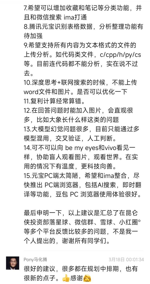在收到腾讯股东总结的一位客户对腾讯元宝的十条产品建议后,他的回复就像产品经理埋彩蛋一样:「建议不错。许多人都在计划中排期,也有很新的想法。」