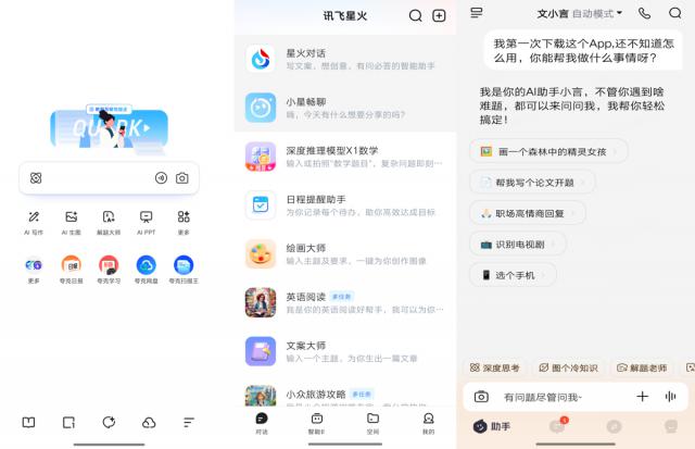 ▲从左到右分别是夸克、讯飞星火、文小言页面。