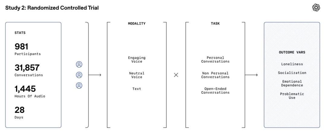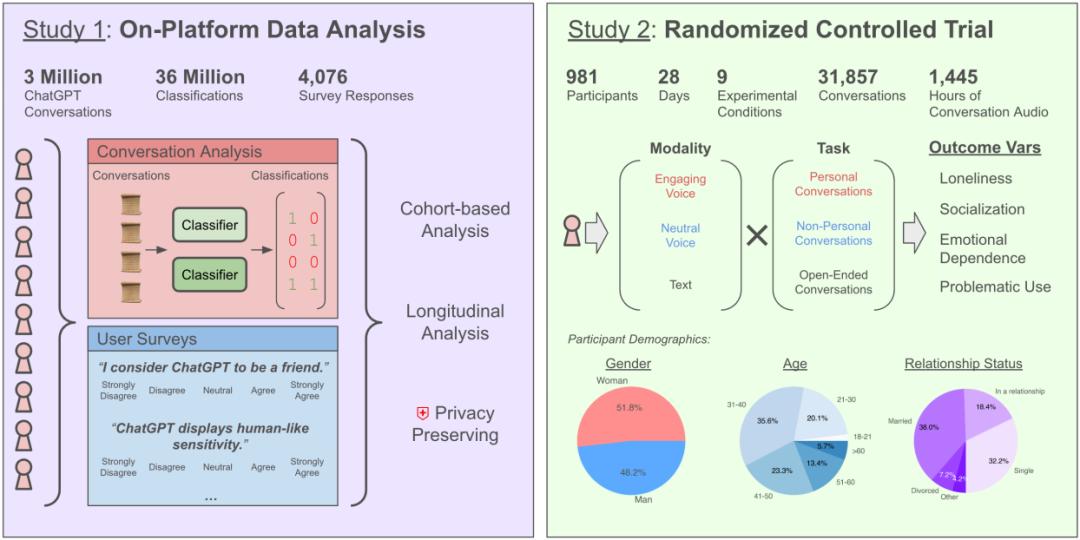 基于此,OpenAI与麻省理工学院媒体实验室进行了深入研究。通过两次平行研究,探讨了ChatGPT(重点关注高级语音模式)与用户的情绪状态、行为和体验将受到多大影响。