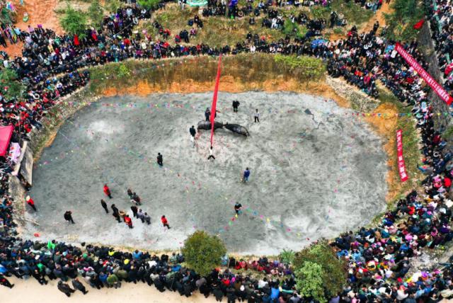 当天,贵州省黔东南苗族侗族自治州锦屏县固本乡举行 2025 三月初九,年新民片区养殖斗牛民俗活动,来自各苗乡侗寨的人们聚集在斗牛塘里,斗牛庆祝着养殖。