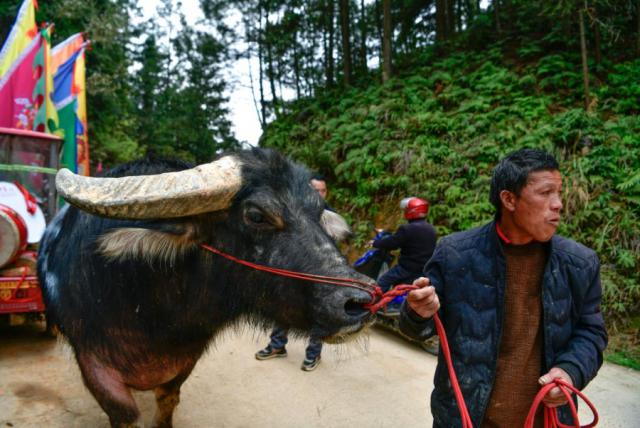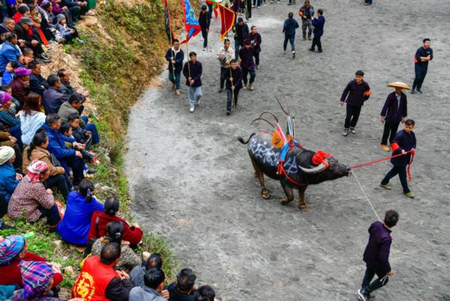 △ 4 月 6 日本,在贵州省锦屏县固本乡东庄村,参加斗牛活动,准备进场。新华社记者 杨文斌 摄