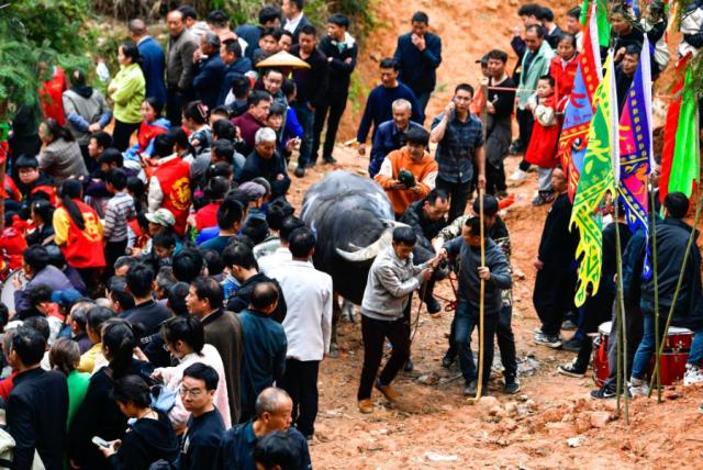 △ 4 月 6 日本,人们在贵州省锦屏县固本乡东庄村观看斗牛游塘仪式。新华社记者 杨文斌 摄