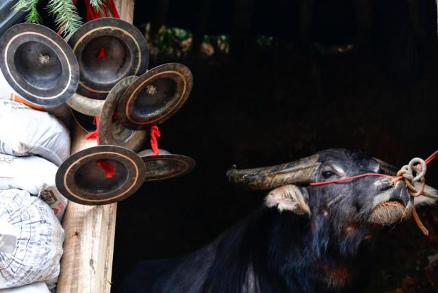 △ 4 月 6 日本,在贵州省锦屏县固本乡东庄村,参加斗牛活动的水牛正在等待进场。新华社记者 杨文斌 摄