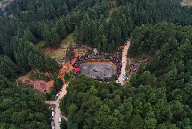 △ 4 月 6 日本,人们在贵州省锦屏县固本乡东庄村观看民间斗牛(无人机照片)。