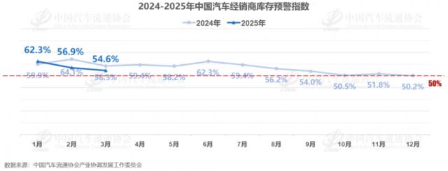 根据中国汽车流通协会发布的信息 3 月“中国汽车经销商库存预警指数调查” VIA(Vehicle Inventory Alert Index)显示,2025 年 3 月中国汽车经销商库存预警指数为 同比下降54.6% 3.7 %,环比下降 2.3 %。与前两个月相比,中国汽车经销商库存预警指数仍处于荣枯线以上,处于低迷范围内,但情况较前两个月有所改善。