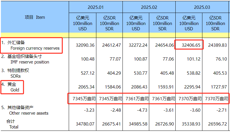 另外,截至2025年3月底,我国外汇储备规模已达32407亿美元,比2月底上涨134亿美元,上涨0.42%。受主要经济体宏观经济数据、财政货币政策和预期等因素的影响,2025年3月,美元指数下跌,全球资产价格整体下跌。当月外汇储备规模上升,汇率转换与资产价格变化等因素综合作用。中国经济运行总体稳定稳定,一揽子存量政策和增量政策继续取得显著成效,高质量发展扎实推进,为外汇储备规模保持基本稳定提供支撑。