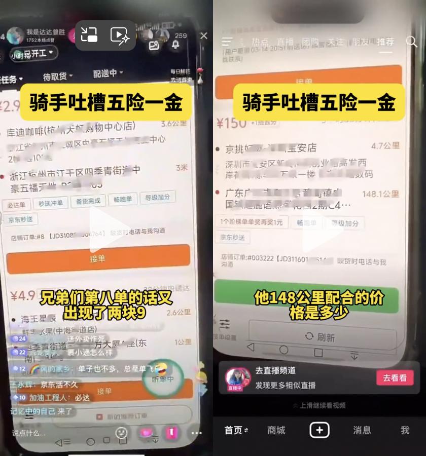 然而,根据曾胜在直播间的消息,全职骑手的订单并不是很容易。曾胜拍摄的截图显示,在JD.COM外卖上线满月时,上海出现了2.9元的送货单,还有148元、3小时以上、150公里的订单——对于老骑手来说,价格低于5元,或者每公里低于3元的订单,都可以称之为“垃圾单”。