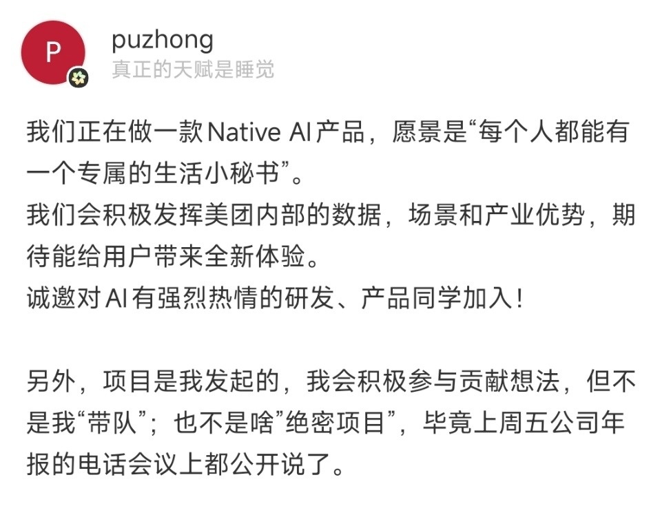 日前,美团核心地方商业CEO王莆中在社交媒体上发布消息:美团正在做一个Native AI商品,愿景是“每个人都可以有一个专属的生活秘书”。
