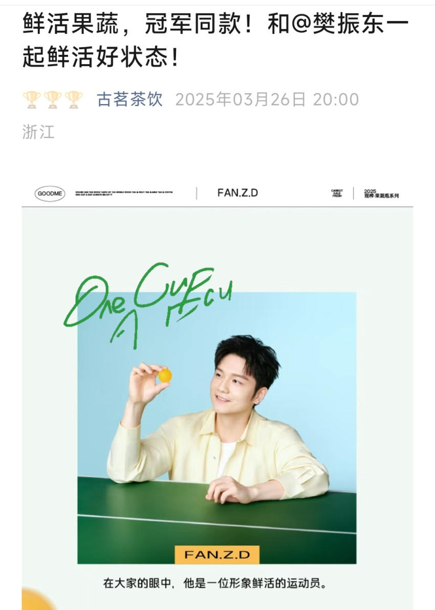 最近,古茗宣布乒乓球运动员樊振东为他的新鲜水果和蔬菜系列代言人。