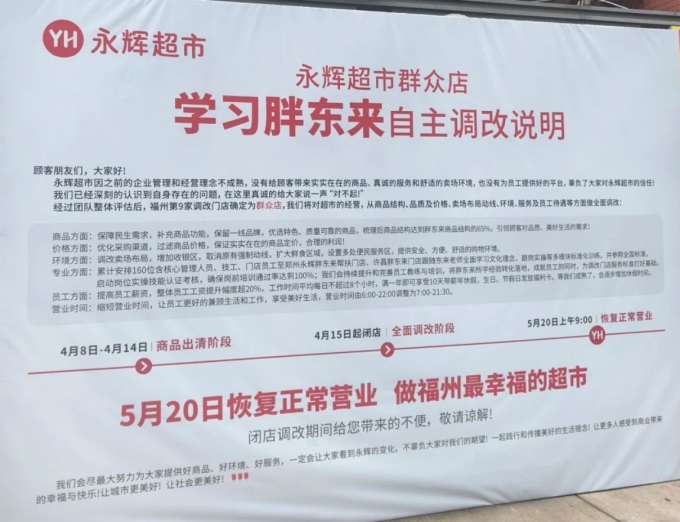 联商快讯:四月七日消息,福州永辉超市群众店即将开始自主调整,成为福州。第九家进行胖东来式调整的店铺。