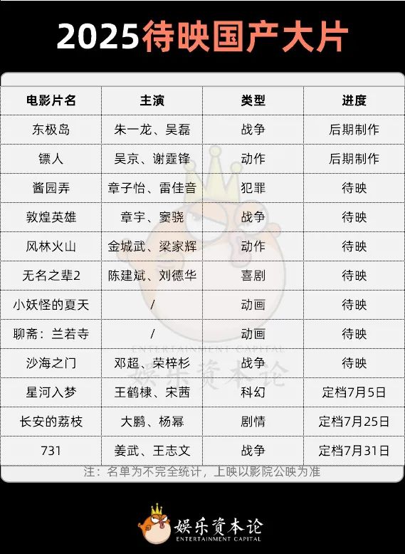 看看娱乐资本理论。目前,《东极岛》、《镖人》、《731》等国产大片正在上映/制作中。目录如下。希望他们能突破很多爆款电影,带动整个市场向上改善,打破行业困境。