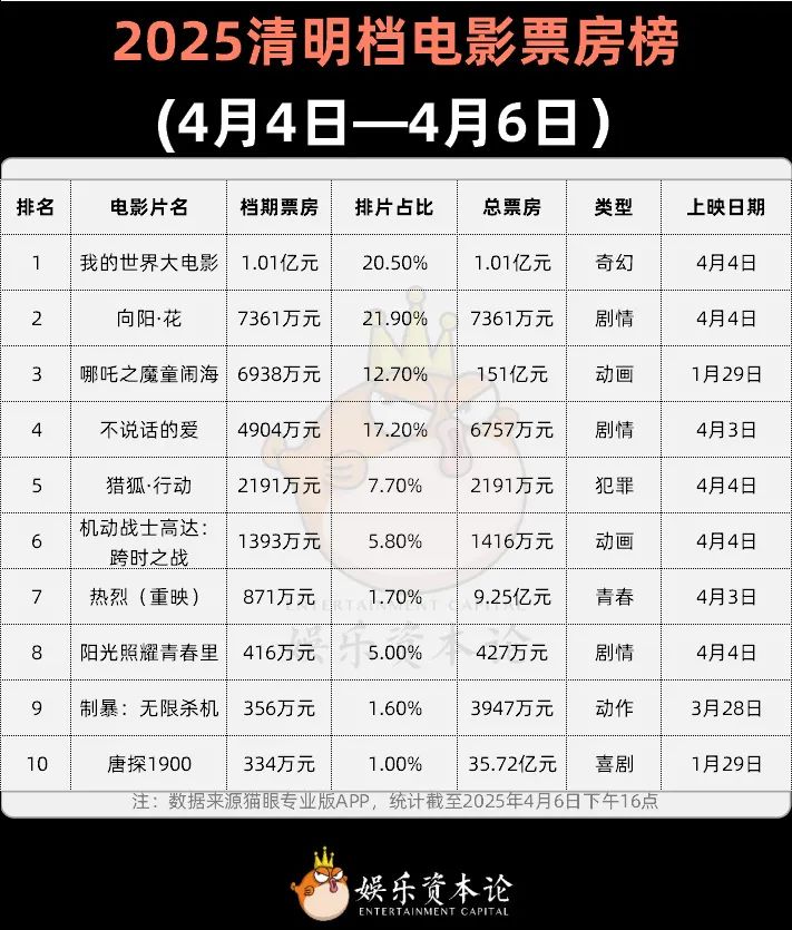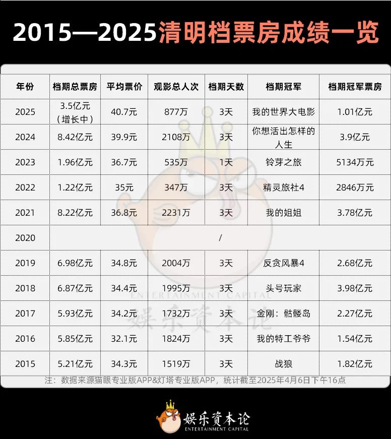 清明档(4月4日至4月6日)在2025年中国大陆电影市场尚未结束,但档期票房并不乐观。