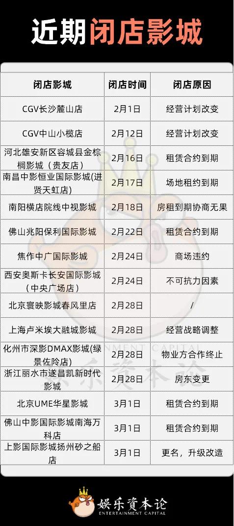 根据娱乐资本理论的统计,在2月底3月初的半个月内,至少有15家影院公开发布了关闭店铺的通知。大多数影城关闭店铺的原因是租赁合同到期,CGV、卢米埃两家公司正在调整运营计划,显然已经有计划地退出了一些市场。