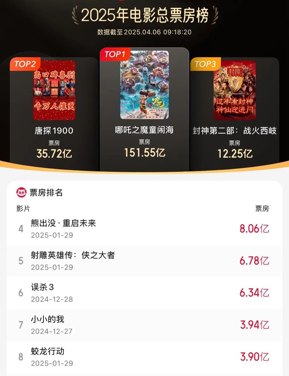 截至4月6日,《哪吒2》在mainlandChina市场票房收入151亿元,在中国电影史上排名第一。之前业内有句话说哪吒2有票房虹吸效应,认为它的强势表现会影响同档电影。