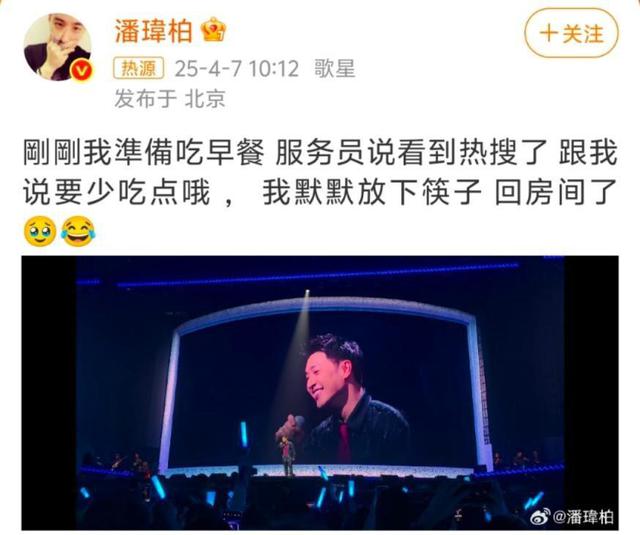 潘玮柏中午在微博发了一篇作品,很搞笑。他说早餐时被服务员告知少吃,然后默默放下筷子回房间。