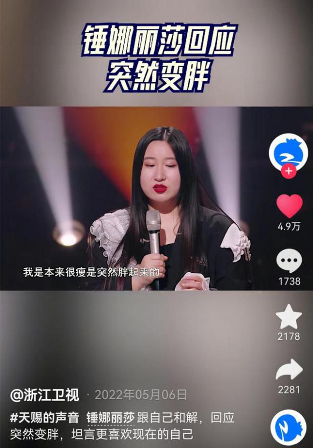 后来,锤娜丽莎谈到了一个严肃的话题。她说:“把肥胖自己列为‘审美多元’和‘健康美’的一巴掌,在网上夸那些胖得喘不过气来,身体负担已经超负荷的女生,很漂亮,很爱自己,甚至像‘一个小蛋糕’。”