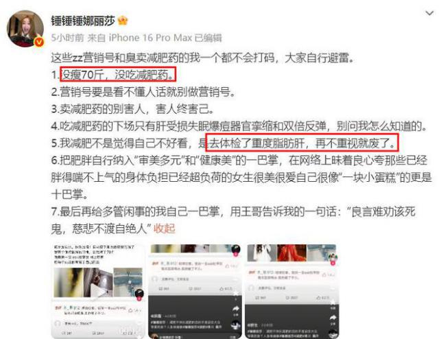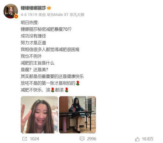 因此,4 月 7 日深夜,锤娜丽莎发了一段视频回应成功减肥 70 这是公斤的事。