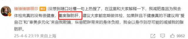 此外,锤娜丽莎在评论区回复网友称,她体检检查出重度脂肪肝。
