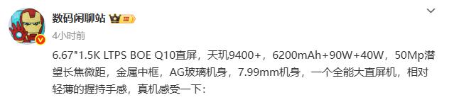 跟上面 OPPO 同样上了天玑 9400 辅以新芯片 6200mAh 电池 90W 有线 40W 无线闪充,后置 5000 万蔡司三摄带潜望长焦,微距。