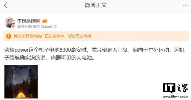 博主 @李昂昂昂啊 今天发文透露,荣耀 Power 手机将内置 8000mAh 电池,芯片为入门级,更倾向于户外活动。