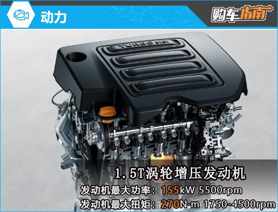 动力方面,新车采用 1.5T 四缸直喷涡轮增压发动机,最大功率 155kW、最大扭矩 270N · m,匹配 9 速手自动变速箱。变速箱档位齿比较密集,在相同速度下能降低汽车转速,从而达到提高燃油经济性的目的。