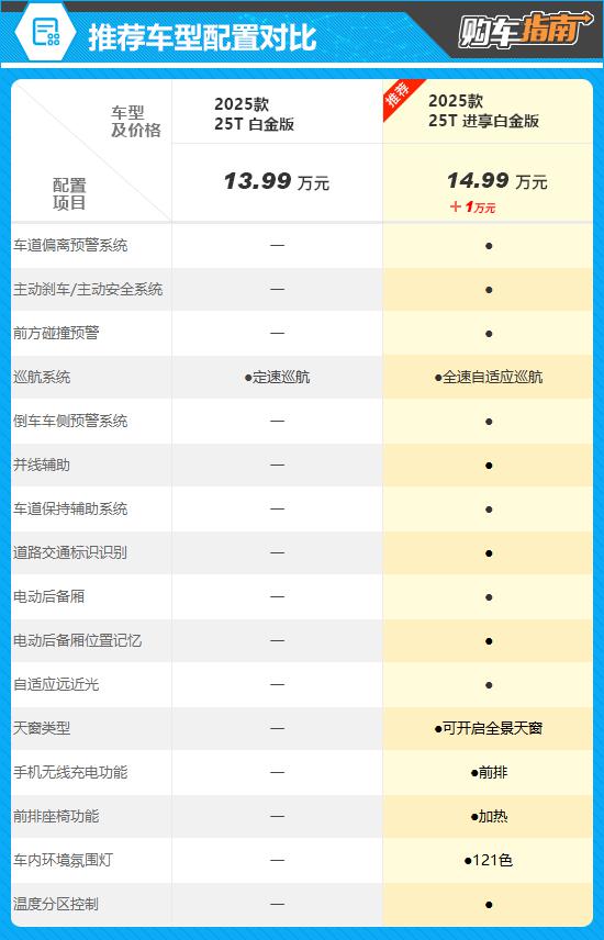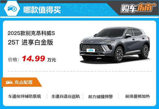 就综合配置和价格而言, 2025 上汽通用别克昂科威 S 消费建议,小编推荐 25T 享受白金版。与低级车型相比,推荐车型在主动安全配置、驾驶功能配置、舒适性配置等方面都有了明显的提升。例如,更多的主动制动器 / 主动式安全系统,全速自动巡航,车道保持辅助系统,自适应远近光,前排座椅加热等。,但是价格只高于 1 万元,可谓物超所值。