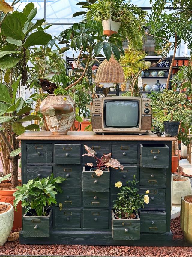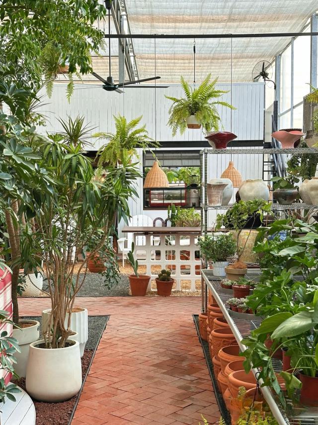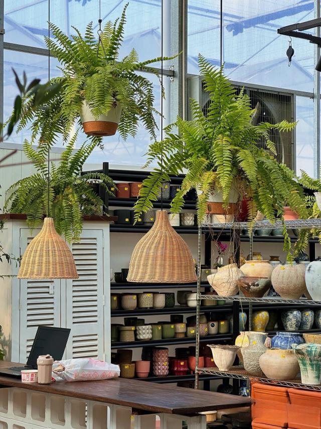基地里的「檐下花园」咖啡馆可以称之为城市绿洲——悬挂的绿色植物自然从屋顶上垂下,地上有各种蕨类植物。厌倦了购物,点一杯手工制作的咖啡,坐在绣球花墙前,仿佛置身于南方庄园。