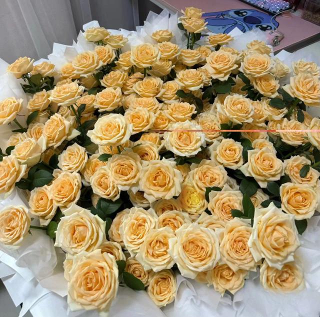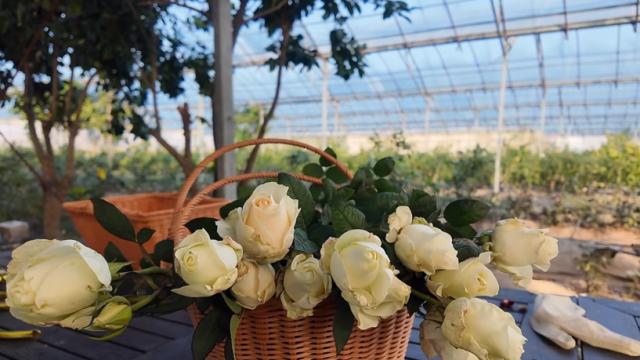 在新生的绿色树枝上,饱满的花蕾正在悄然膨胀,几朵花迫不及待地露出了微笑。蜜蜂忙着走过鹅黄色的“金香玉”,而粉色的“荔枝玫瑰”则散发出甜甜的果香。花农精心打理的玫瑰株有半人高,粗壮的树枝上长满了尖刺,却托起了比拳头还大的花蕾。