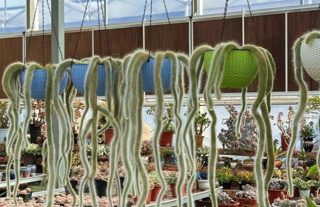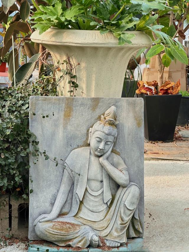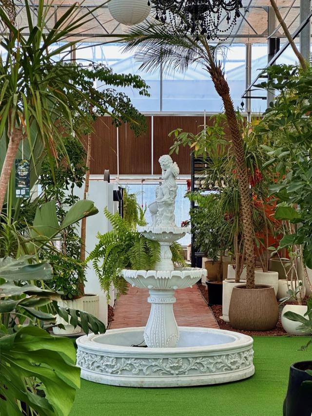 这儿的花草品种丰富,价格合理,性价比高。展示架上陈列着不同风格的陶罐花盆。