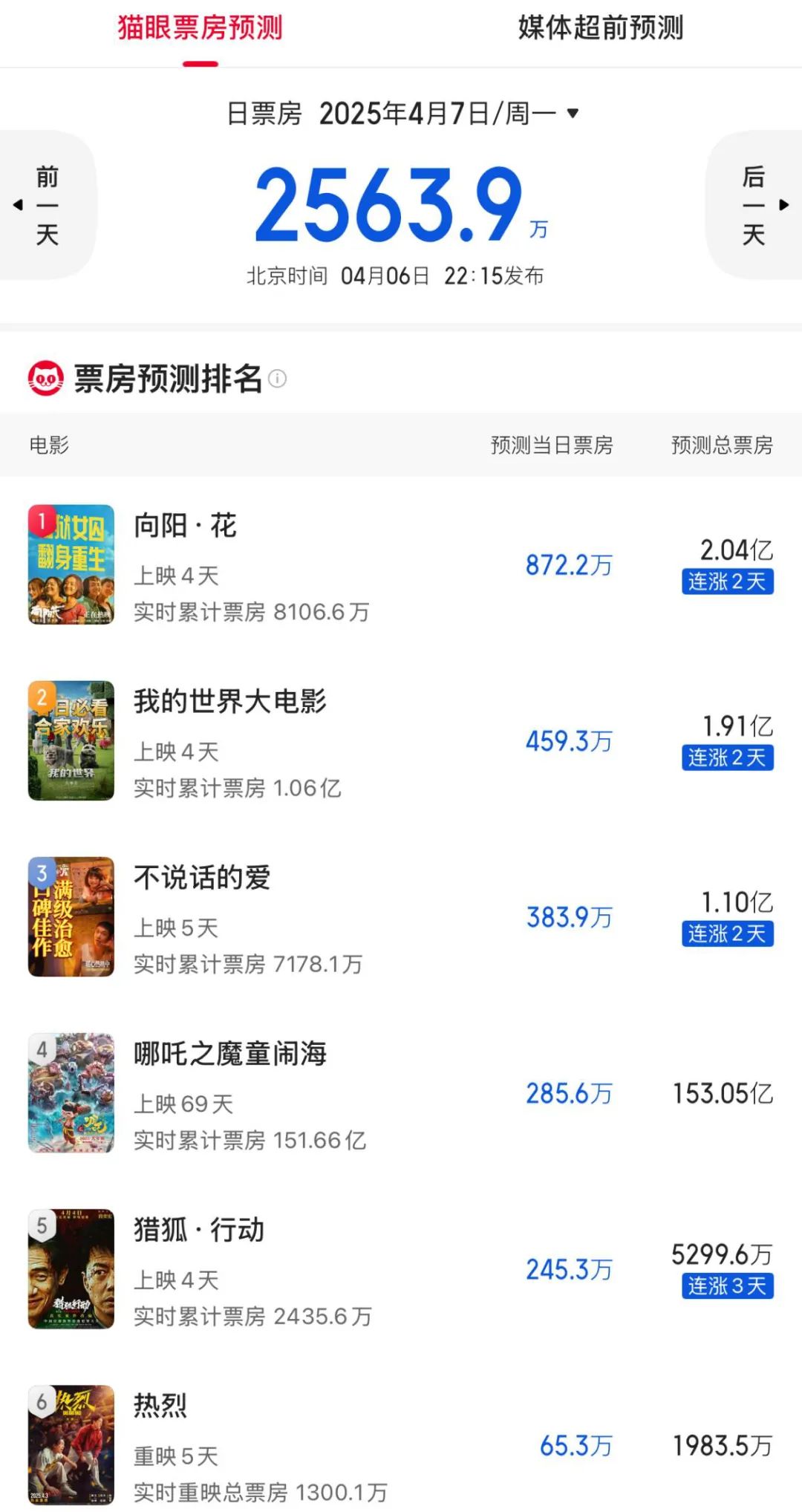 上映第一天没能突破5000万大关,三天最后累计票房只有1.06亿元。上映前猫眼想看的《向阳·花》,第一天排片率遥遥领先,只拿到了第二个孩子的位置,而预售票房领先档期的《不说话的爱》和号称成本2亿元的《猎狐·行动》都输给了《哪吒魔童闹海》。