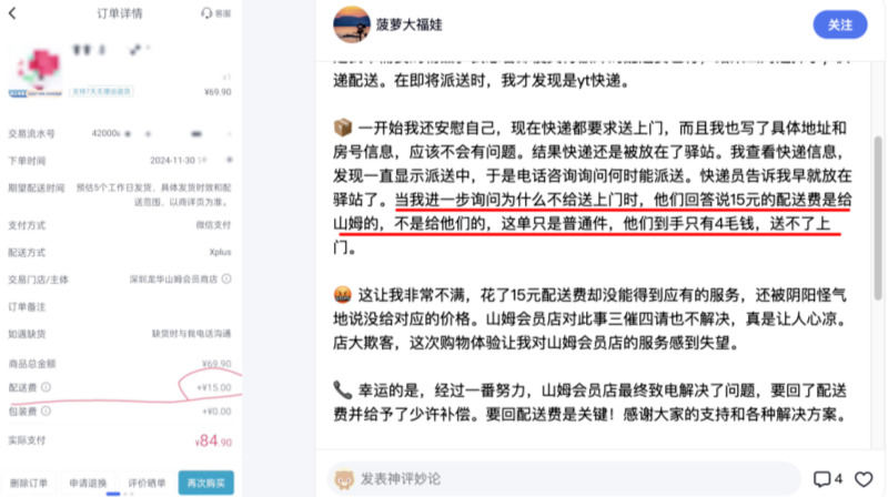 山姆与JD.COM深度合作,但在沃尔玛清仓JD.COM股票后,山姆开始寻求第三方合作伙伴。在这个空档期,一些消费者也公开抱怨山姆的配送服务正在下降,这极大地压缩了合作伙伴的盈利空间。