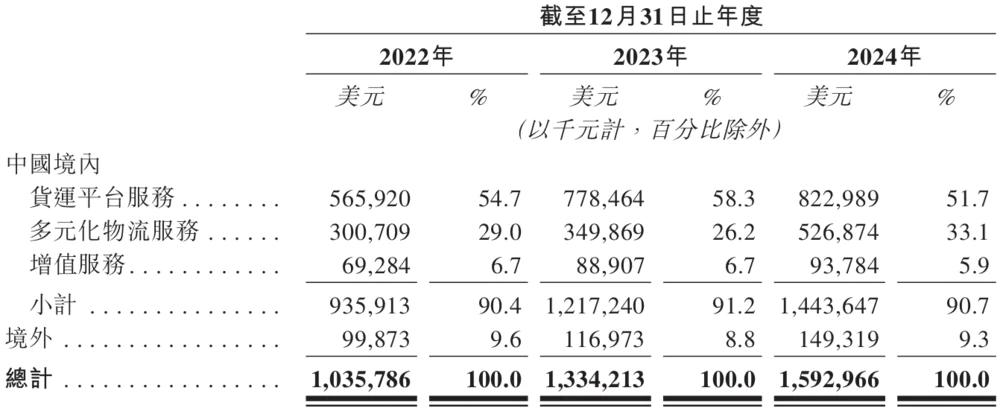 最后是货运拉拉多元化业务的扩张。市场上很多人把货运拉拉当成“搬家公司”,但实际上,搬家业务只占其整体收入的一部分。根据货运拉拉的招股书,其收入来源主要分为货运平台服务、物流服务、增值服务和海外服务四个部分。具体来说: