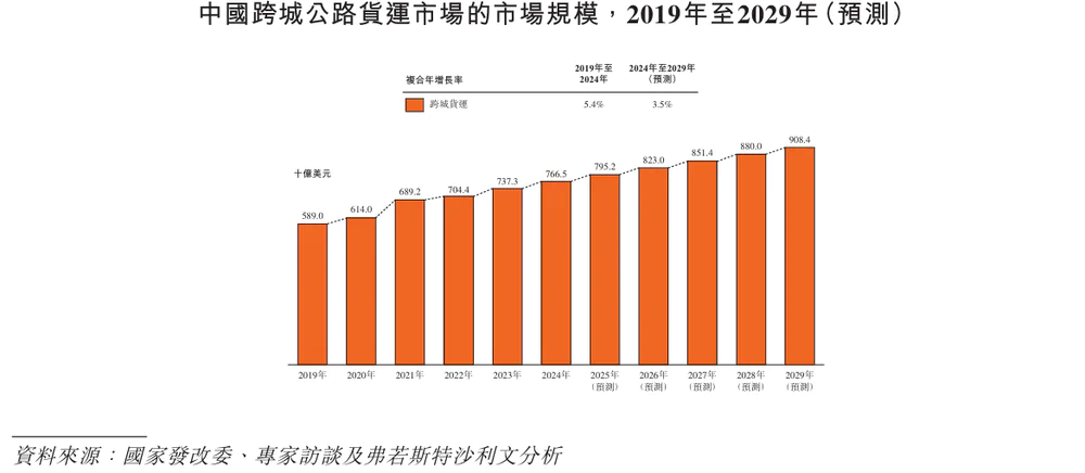 据弗若斯特沙利文介绍,2024年,跨城货运板块全球交易总额(GTV)预计将达到7,665亿美元,预计在2024-2029年期间,复合年增长率将稳步增长3.5%。尽管同城货运市场规模巨大,但行业也面临着同样巨大的问题:非标准化、低频需求和激烈的竞争。
