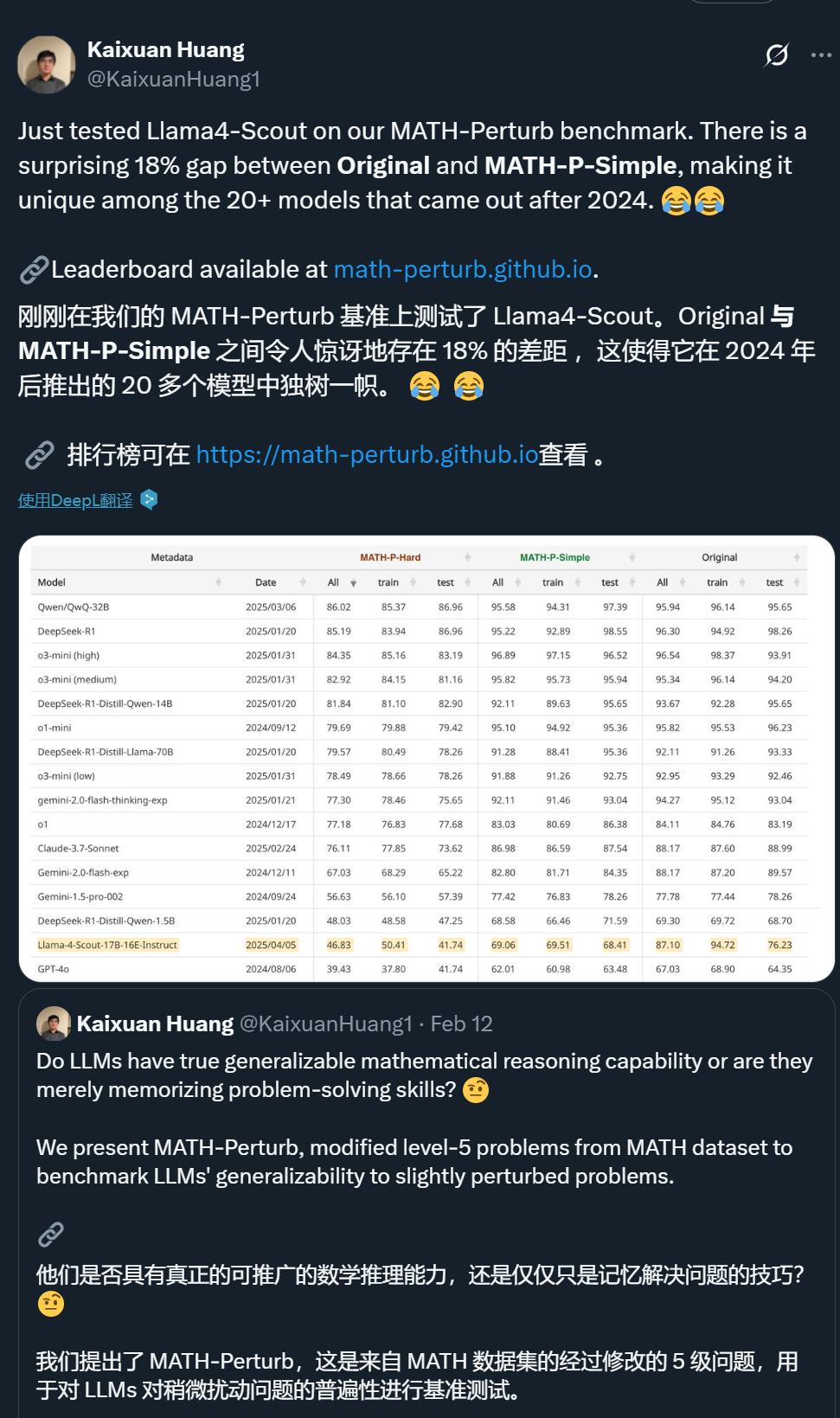 然而,一些测试者发现了一些有趣的现象。比如普林斯顿大学博士生黄凯旋指出,Llama 4 Scout 在 MATH-Perturb 上的评分「独树一帜」,Original 和 MATH-P-Simple 数据上的表现差距很大(两个数据本身非常相似,后者只是在前者的基础上进行了轻微的干扰),这是非常令人惊讶的。