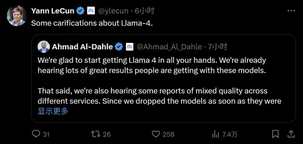 很高兴能让大家用上 Llama 4.我们听说人们使用这些模型取得了许多优异的效果。即便如此,我们还是听到了一些关于不同服务质量参差不齐的报告。因为我们在模型准备好之后就推出了,所以我们预计需要几天时间才能完成所有的公开部署。我们将继续努力修复错误,吸引我们的合作伙伴。
