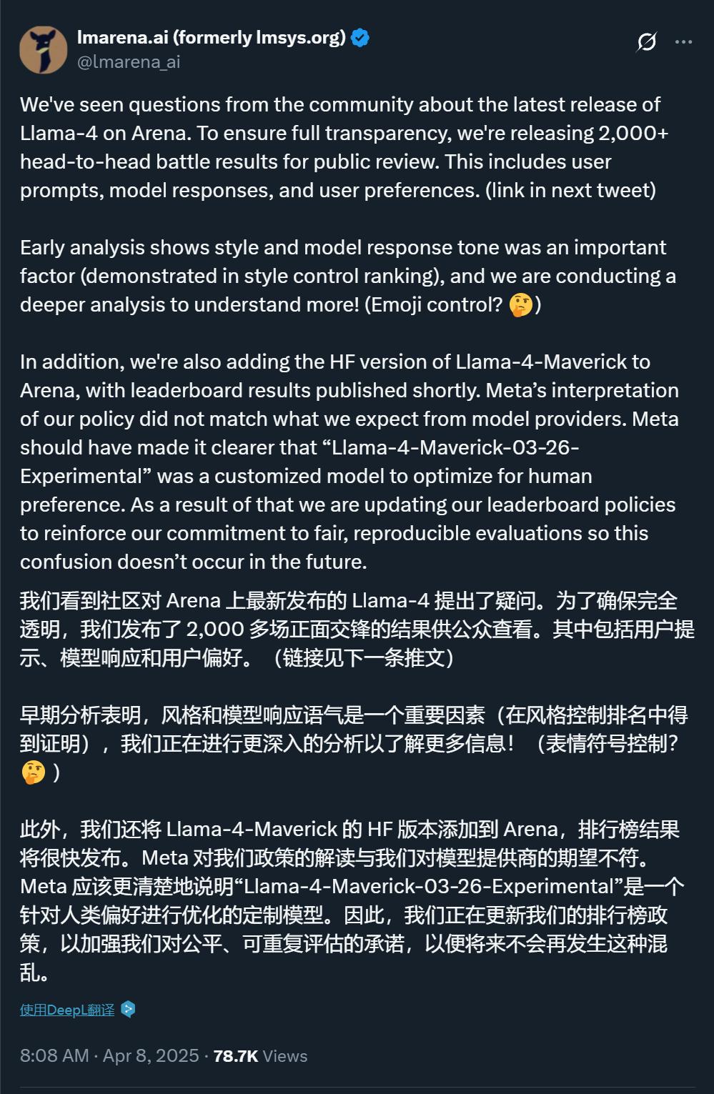 针对当前版本问题,大模型试炼场官方账号也给出了回应,称 Meta 这是对平台系统的误解,应该更清楚地说明它们的模型是定制模型。另外,他们还会 Meta 在 HuggingFace 上面发布的版本被添加到试炼场进行重新测试,结果需要公布。