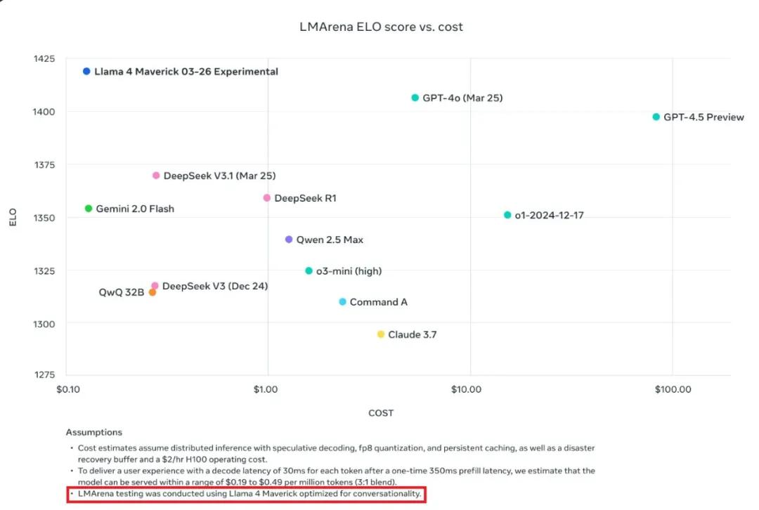虽然数学方面,这个问题还没有答案。然而,就对话而言,Meta 的确指出,他们已经改进了对话。公告中提到,在大型竞技场上,他们提到 Maverick 是「实验聊天版本」,同时,官方 Llama 站点上的图表也透露,这个测试已经使用了。「对对话进行优化 Llama 4 Maverick」。