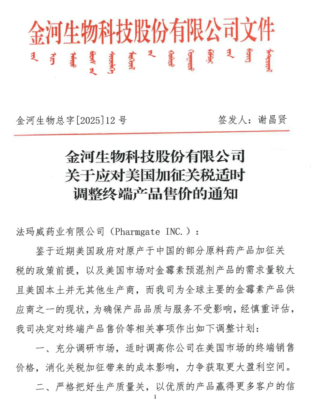 生产兽药抗生素的金河生物,在4月1日宣布,对控股子公司法玛威药业有限公司的美国终端市场涨价!