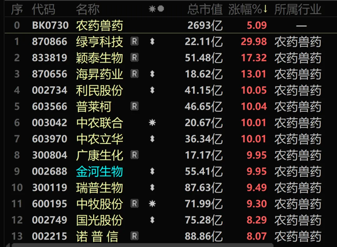 4月7日,大盘暴跌当天,种子股、粮食股、蔬菜股涨幅居前,农药兽药板块下跌超过8%。但到了4月8日,农药兽药板块涨幅就超过5%,其中北交所的绿亨科技30cm超级大号涨停,还有多家涨幅10%或更多。
