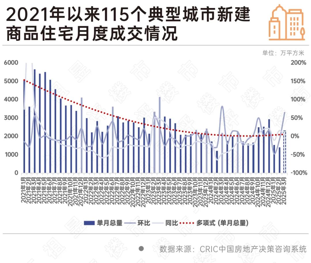 从市场来看,在调控政策持续优化背景下,2025年一季度楼市成交“筑底企稳”,延续弱复苏走势:1-2月传统春节假期迎季节性回落,但成交规模基本与去年持平:前2月115个重点城市商品住宅成交面积2930万平方米,同比持平去年,月均较2024年四季度月均降幅为45%。