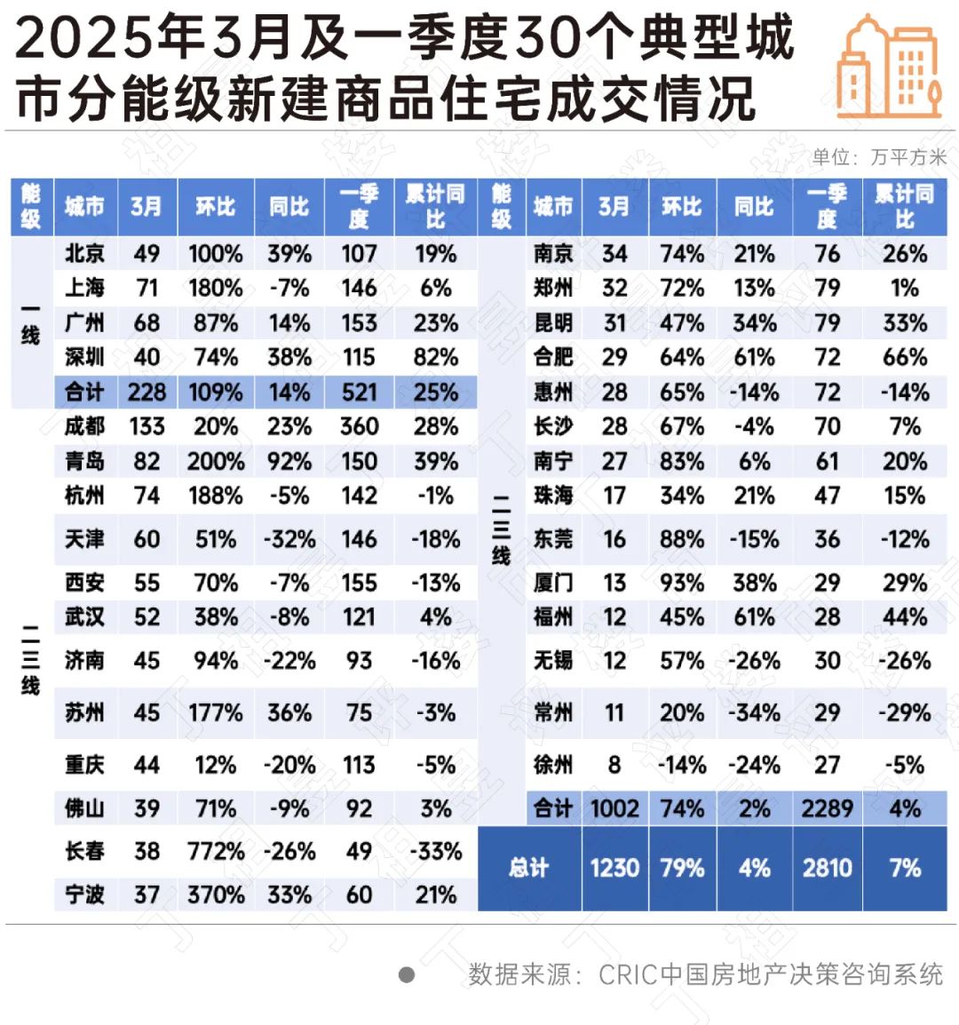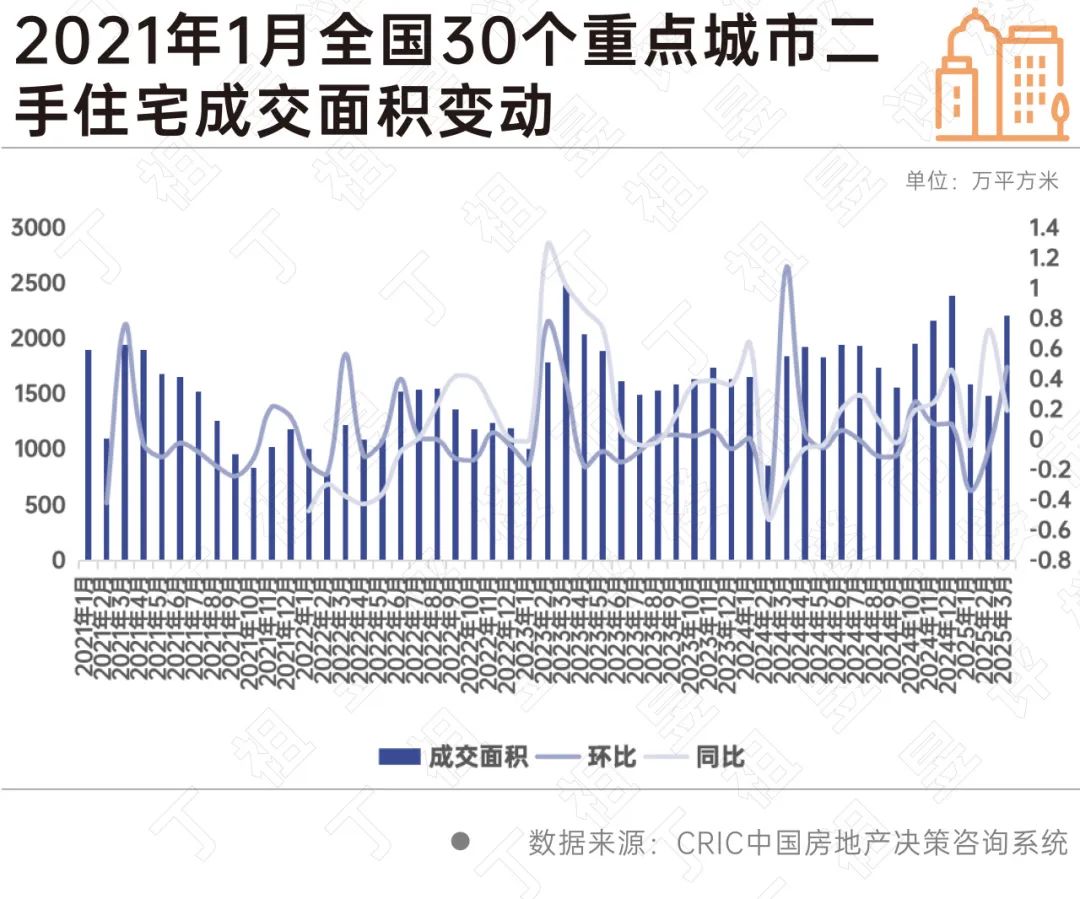 从二手房来看,2025年一季度,30个重点监测城市二手房累计成交面积预计为5300万平方米,累计同比增长21%,较去年四季度下降19%。