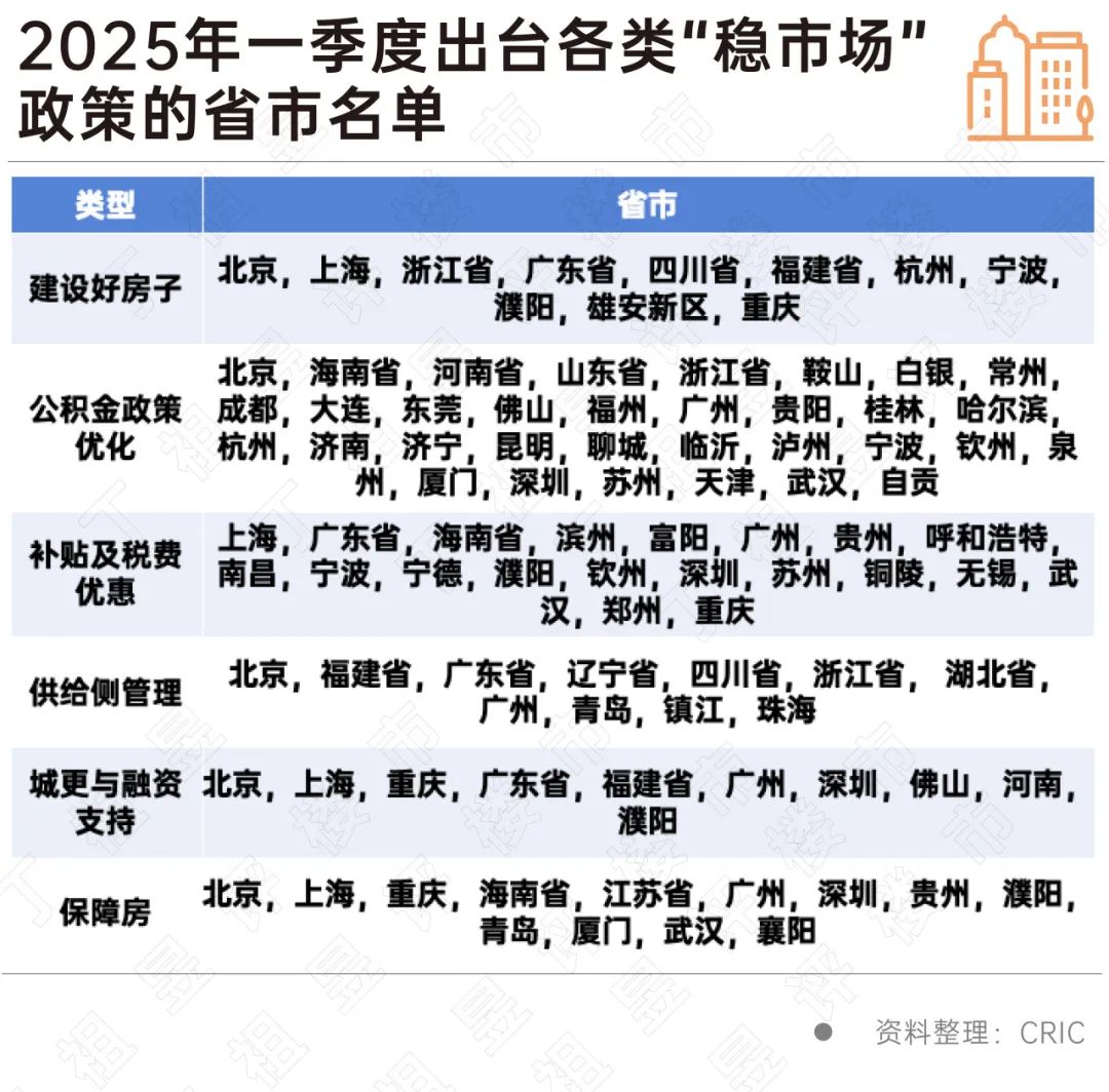 2025年一季度,地方房地产调控政策继续优化,据CRIC统计,全国至少66个省市出台124次稳市场政策。