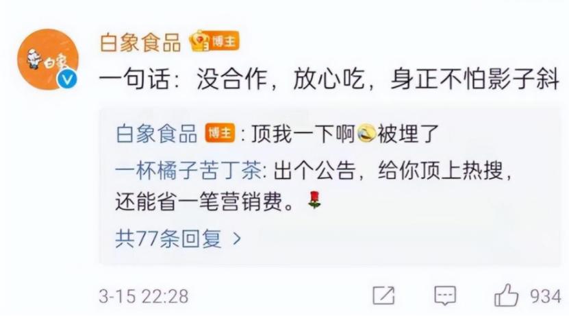 2022年,随着“土坑酸菜”被曝光,方便面行业陷入了舆论风暴,白象在微博评论区迅速回应“没合作,放心吃,身正不怕影子斜”,带来了一波泼天的流量。