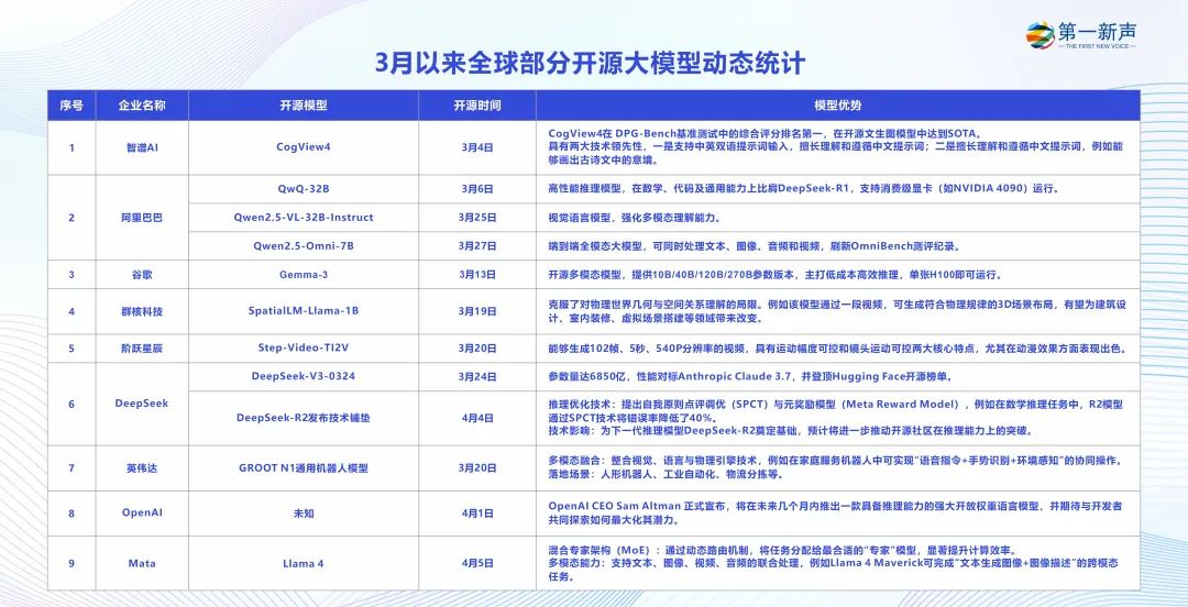 根据不完全统计,仅今年三月至今,OpenAI、谷歌、Meta、英伟达,阿里,DeepSeek、智谱AI、全球9家科技巨头,如群核科技、阶跃星辰等,已经密集发布了10多种开源模式。并且,开源模型的性能不断突破,Hugginging,世界上最大的AI开源社区。 Face模型列表不断刷新...无论是科技巨头还是创业公司,都在加速拥抱开源。
