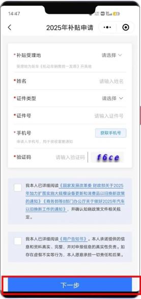 ②选择补贴受理地点,按要求输入个人信息,点击下一步。