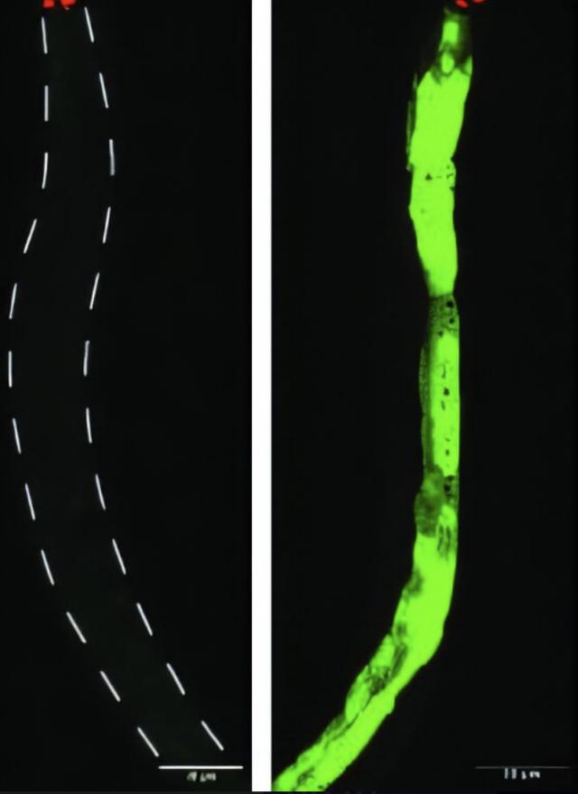 食用无害细菌后,线虫非常健康,无免疫反应(左); 服用病原菌后出现免疫反应(右) | 参考资料 [ 5 ]