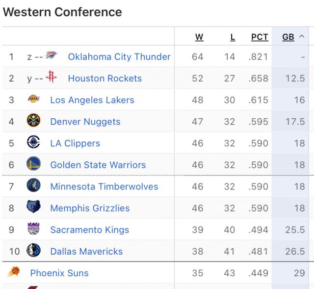 不得不说,狂野的西部是值得的。西部的排名在东部前六名直达季后赛名单很早就确定了,七到十名附加赛名单很早就确定了。西部第四的掘金只领先了半场胜利,西部第五、第六、第七、第八名的快船、勇士、森林狼、灰熊的胜利完全一样,任何一场比赛都会影响最终的结果。